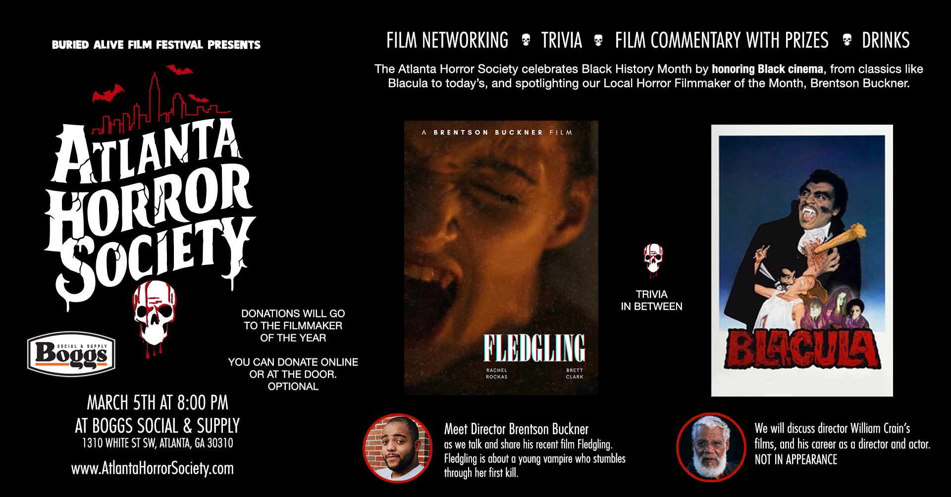 We’re now accepting optional donations online + at the door, and all proceeds go directly to our featured filmmaker to help fund their next project. Let’s lift up Atlanta horror together!