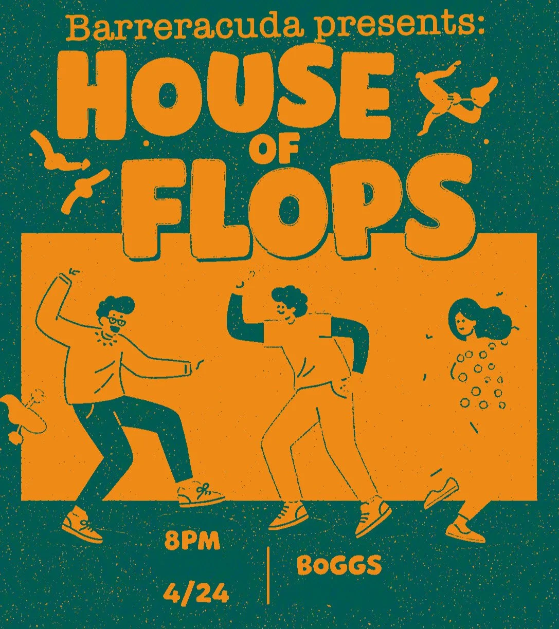 Barreracuda Presents: House of Flops Thursday, April 24, 2025 8:00 PM 11:00 PM Google Calendar ICS Next FLOPS is back at Bogg’s! DM @houseofflopsatl to RSVP a spot to perform!New format: I’ll have spots to try out clown bits, introduce an original character, or just get reps on stage playing games and exercises. Crowd decides who lives or cries!