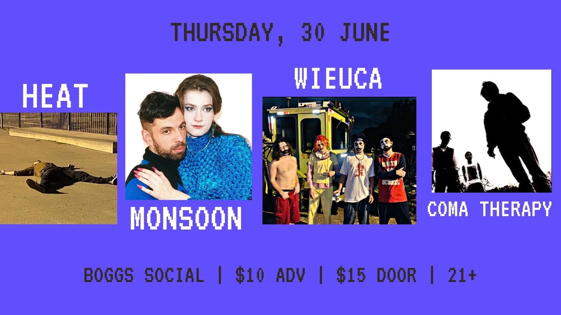 Thursday, June 30th at Boggs Social & Supply: Monsoon, Wieuca, Coma Therapy and Heat at Boggs!