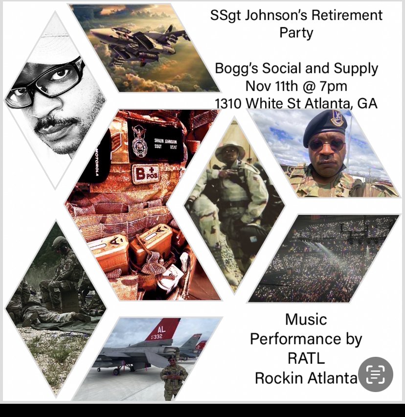 Saturday, November 11th at Boggs Social & Supply: SSgt Johnson’s Retirement Party with performances from RATL Rocking Atlanta.