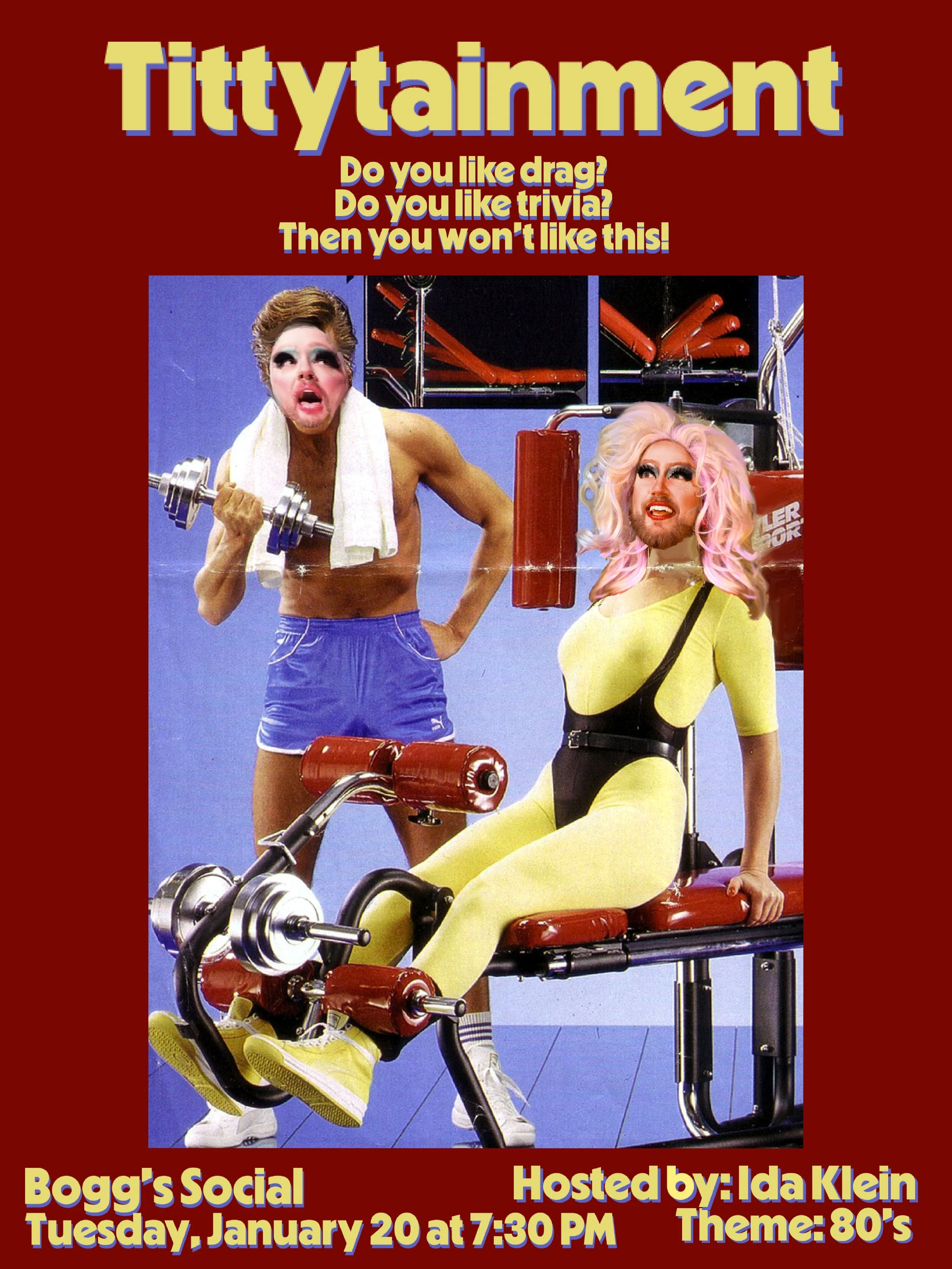 Do you like drag? Do you like Trivia? Then don’t come to this! Tittytainment Drag Trivia Night returns with your host Ida Klein! Free! Tipping Encouraged!